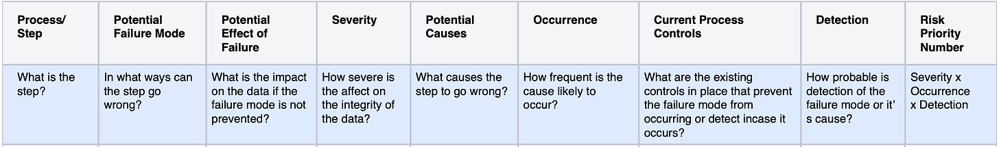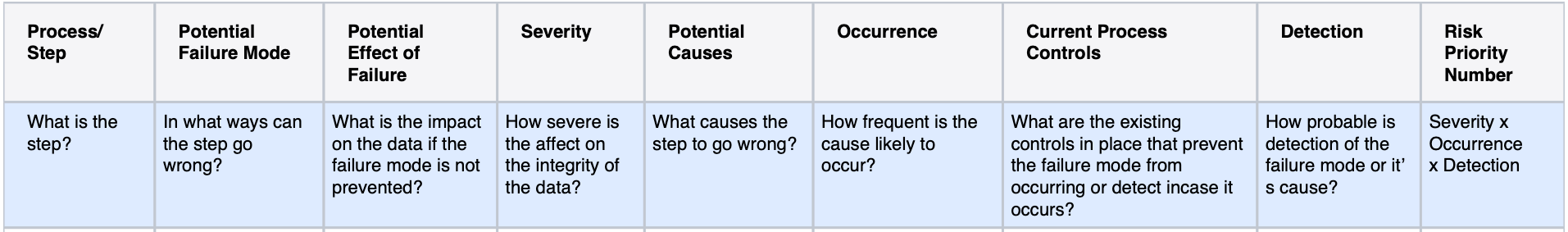 This is another technique that I wouldn't employ every time, but rather its application would be contingent on the Risk Rating assigned to the proposed story. I find Failure Mode Analysis, bears similarity to the identification of various scenarios and edge cases, encompassing the testing of multiple failure points within the system. I like conducting a Failure Mode Analysis because it compels me to concentrate on potential failures and consider strategies to address them, particularly if they are not preventable. The template provided below outlines the information I try to gather, to get a Failure Mode Analysis going.